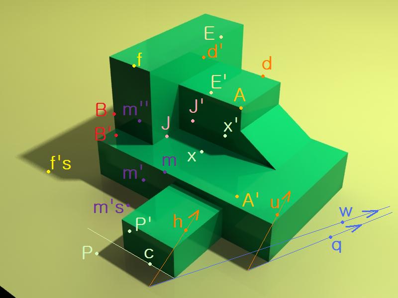 Si construimos la dirección de los rayos h u en el espacio definido por puntos límites de las sombras y los puntos de la pieza correspondientes, tenemos que en la intersección de estas dos líneas h u, está el punto de luz e incide sobre la vertical de la intersección de las rectas w q.